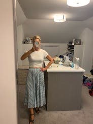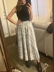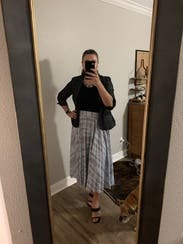Love a good midi length skirt. This was super cute for a work day from home. Color was pale blue but really pretty. Skirt is definitely great quality. Would rent again