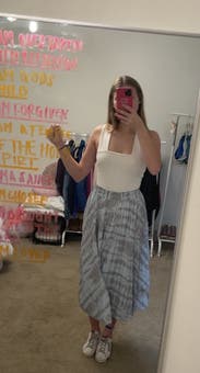 I love this skirt so much I'm still thinking of buying it. The material is light but also durable, and great for very hot weather. I wore it multiple times on my trip through France and Italy during a heat wave. It's flattering, cute, very hard to get dirty, and versatile. One of my fave rentals of all time!