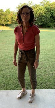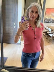 This top stands out with its bold color and unusual buttons that go all the way to the back. It’s more form-fitting than I usually wear, and the ribbed fabric has some stretch but is thick enough to be a little smoothing, and it doesn’t wrinkle. The sleeves are on the short side and I don’t love the way the edges curl up. The V-neck isn’t overly revealing with the bottom 3 buttons fastened. Technically, you could button another (there are holes for all the buttons, including the ones in the back), but it seems as though it’s intended to be worn with 3 because the 4th makes it pull in an odd way (though YMMV depending on bust size).