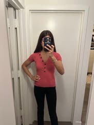 Cute top, a little fun and different with the buttons. Fit nicely but was definitely a little tight in the armpit area. My hair also got stuck in the buttons on the back - no big deal but a little annoying. Would wear my hair up next time :)