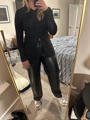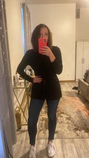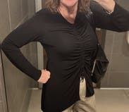 Chic form fitting top. As much as it looks like it’s stretchy material, it didn’t give too much. Felt compression sort of. Unique silhouette. Def felt like “cool girl” in this