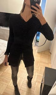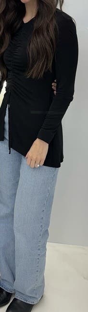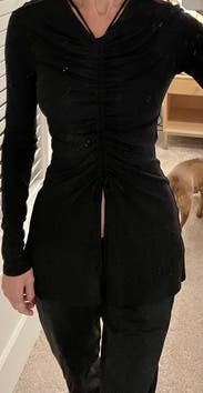 wow! i loved this top! i pulled the strings to ruch it completely as tight as possible, which made the top look so good! the top is two layers of thick mesh, and the ruching really accentuates your figure. it has long sleeves, but theyre thinner material, so it was actually really nice and provides to the effortlessly cool style! i did not tie the strings in bows, but i did a simple knot to hold them up for the night. wore this to work and it slayed