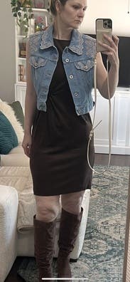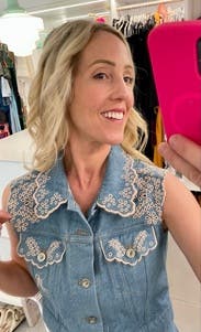 I write historical fiction for kids & was attending a Book Festival to sign books. I wore this vest with a RTR denim skirt & it was the perfect blend of cute, comfy, elevated, and on brand with me! I got tons of “where did you get this, I love it!” I wore pink v neck under the vest and my brown cowboy boots. Loved the look ❤️