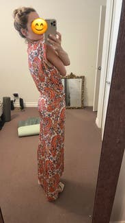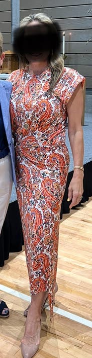 Fabric is more vibrant in person - rich shades of orange blue taupe and ivory. Wear now with sandals and transition to fall with boots and a sweater. Runs large above waist though fabric drapes beautifully and the overall fit is flattering. Draping at waist is best feature. You will need heels if below 5’6…skims the floor on my left side.
