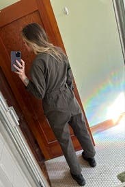 The belt is really high, so if you don’t have a high waist, it almost looks like an empire waist. I ended up belting it behind me so that I could pull it tight enough. It’s cute if you like coveralls, but if you are looking for a slightly more tailor luck, this is not it. Legs are super wide, and you could easily wear jeans and a T-shirt underneath. Not my jimmy-jam.
