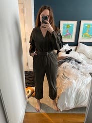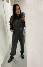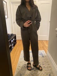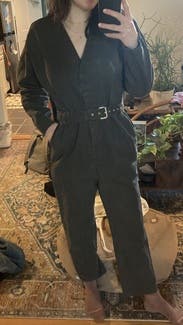 Loved this jumpsuit! It definitely runs a bit boxy so size down. The belt helps give it more shape though!