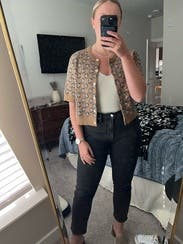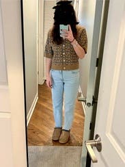 Cute cardigan for work! I didn’t like the extra length of plain brown material on the sleeves so I folded it underneath the sleeve so it wasn’t visible. It was a little itchy, but got used to it pretty quickly.