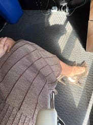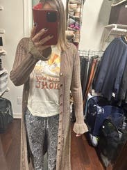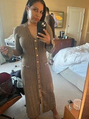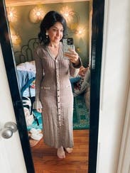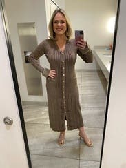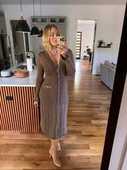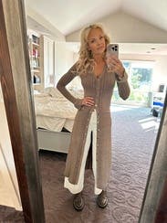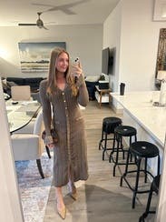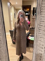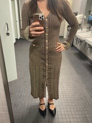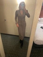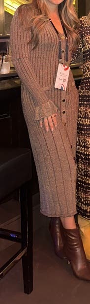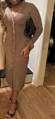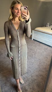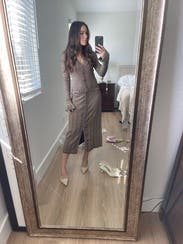 I got so many compliments on this dress it was almost embarrassing! This is a form fitting, sparkly taupe rib knit dress. The sleeves are long with ruffled hem. It is thick and forgiving. Held its shape well. I wore it for an anniversary dinner date and to cocktails another evening. It read as effortlessly elegant, and that is how it felt as well!