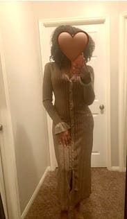 It’s a lot more bold in person than it is in pictures. Very shiny but classy- not too itchy not too heavy. Very shiny. I paired with gold heeled shoes and earrings. I love the snap buttons. They’re about the size of dimes and shiny gold. I got a ton of compliments on the dress and a lot of attention. Very flattering and shows off curves. Speaking of curves, you might need some fabric tape near the hips if you are hourglass- That way it won’t gape between buttons Where you are the most curvy- worked for me. Good for fall day. Long. Love the sleeves.