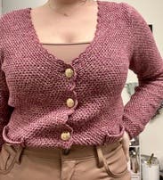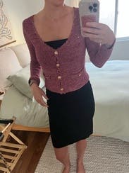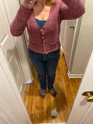 SUPER cute cardigan. Little tight in the upper arm but nothing i couldn’t live with, usually I need to size up to accommodate my chest but I was able to wear a small no issues with the buttons gapping. Needs a tank top under it if you’re wearing into an office but without it this cardi gets a little flirtier with the neckline. Super flattering cut, love the color. Thick enough to keep you warm in corporate AC but not so thick you feel claustrophobic.