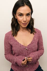This sweater is cropped and the arms don't have much stretch. Even so, I really enjoyed wearing this item. The quality was great and the buttons were so cute. It provided enough coverage while still showing some cleavage. I would rent again and recommend.