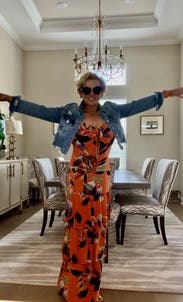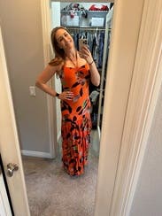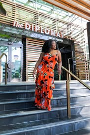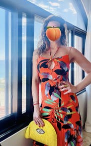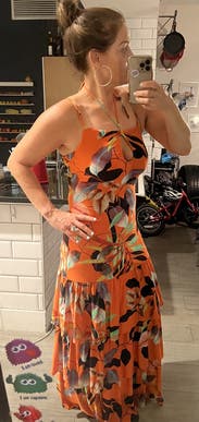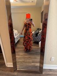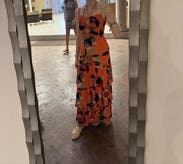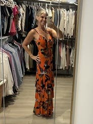Intense orange covered in colorful botanical print and a sexy keyhole cut-out make this Rachel Rachel Roy maxi unrepeatable.