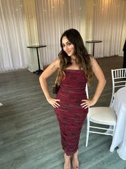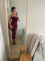 I wore this to a December engagement party. The color fit the season perfectly, the length hit at just above the ankle, and clings to the body. Great pick for petite women.