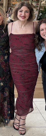 Worn to the theatre and felt so on theme with the deep red and draping. Very comfortable and flattering fit. Easy to sit in and the length is quite long. Effortless style.