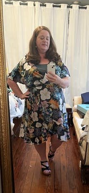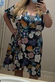 This dress was fabulous. I needed to use fabric tape to keep my bra from showing. It was a pretty floral for summer. I wore it to a conference and got lots of compliments! It's a fake wrap, but worked well!
