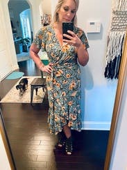 When viewing online, was not sure if I would like the pattern, it is a little bolder than I would normally pick however the dress was super flattering and comfortable and I loved the pattern on and received lots of compliments all night long! It is true to size, mock wrap dress (just has ties sewn to outside of dress, does not actually wrap around, there is a zipper on back) with cute and feminine double ruffle hem line.