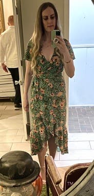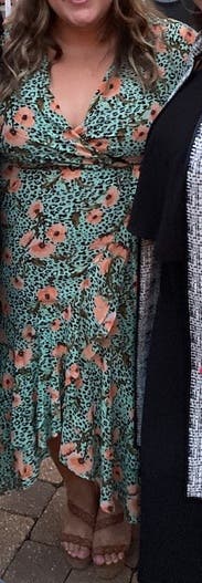 Loved this dress. I wore it to a conference and received so many compliments on it. Love the subtle animal print with floral mixed in. Flattering wrap around dress makes it good for many body types. I ended up pinning the just together just a bit because it's pretty low cut but it wasn't a work event I would have worn it as is. Will rent again
