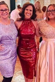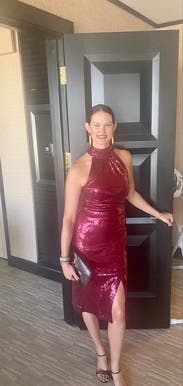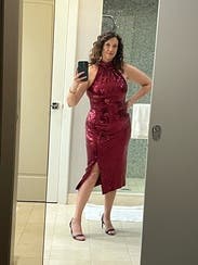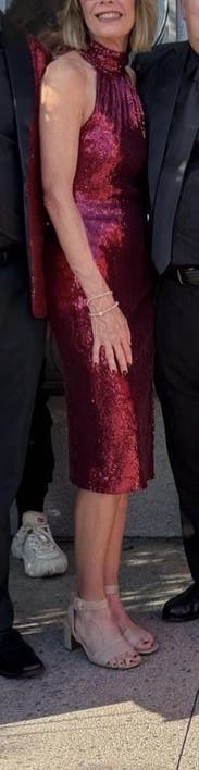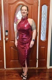 This dress is WOW!! The sparkly red looked so good. The sequins don’t scratch you under the arms or at the neck, which is important for me. The length was perfect, it was youthful and fun but also appropriate and classy! I wore it to formal in New Orleans! I would rent again!! maybe for Christmas…😏