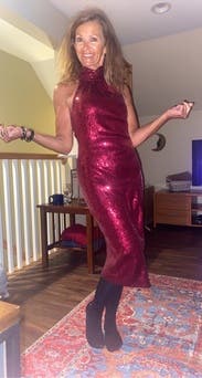 I wore this dress for my work Christmas party. It fit like a glove! It was super comfy and easy to dance in. I received a ton of compliments. I’m a size 6 but wore size 4. Definitely rent a size smaller. This dress made this 53 year old feel like 35 again!