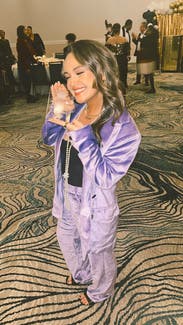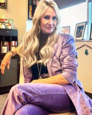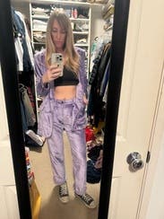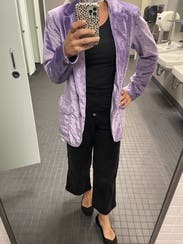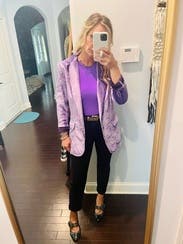 Love this groovy purple velvet jacket paired with matching pants. IG@bethielife