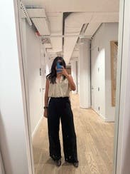 I wore with high waisted wide leg jeans and flats for a business casual look. It was really cute and I received several compliments.