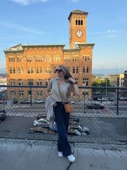 Perfect transitional piece as it’s more of a fall color in a light fabric. Long enough if wearing high rise pants. Can wear a regular bra.