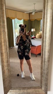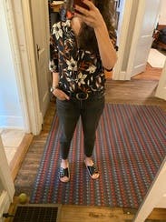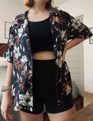 Not something I would normally wear but it was super fun on vacation. Wore it closed and tucked in with a black denim skirt and again open with bike shorts.