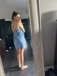 I wasn't crazy about this dress. It's denim material and boxy. Ran a little big but you can tighten. More for a daytime with tennis shoes look.