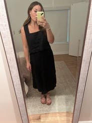 I rented this top and matching skirt for my honeymoon is sicily and it was just the comfy, cute vacation / everyday wear I've been missing. I tend to be a shorts and t-shirt kind of traveler for comfort and it was great to have a cuter outfit to wear that was light and breezy for warmer weather. I purchased both because these were staples for my wardrobe to be worn many times again. Being black it didn't photograph great so was much cuter in person than the photo captures.