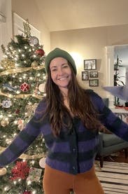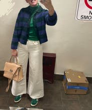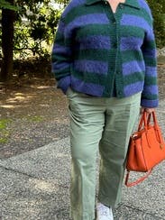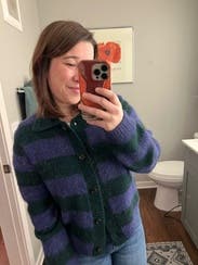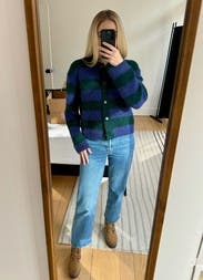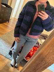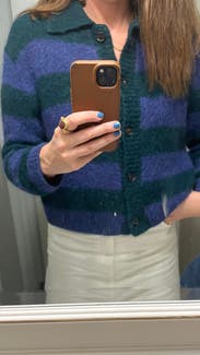 I’m not that into wearing a cardigan as an open layer but it looks great buttoned up as a boxy relaxed sweater. The colors are really fun and it’s super thick and cushy. I wouldn’t say it runs large because I am an XS and I ordered the S for an oversized fit, which was roomy but not huge.
