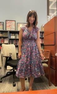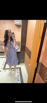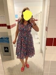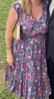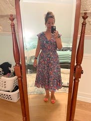 Bright floral dress that I wore for a baby shower. I didn’t particularly like were the cinched part landed on my torso but I like the pattern and colors.