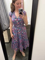 The colors/pattern of this dress photographs SO pretty! I work in a casual office and got a lot of compliments. Fit was comfortable, though I did feel like I kept tugging at the neckline and sleeves to try to fix something about it that didn’t look quite right…the ruffle seemed to be slightly asymmetrical and the sleeves seemed to roll forward? Maybe I should have tried steaming it. Regardless, overall this was springy and cheerful and easy!
