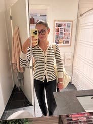 My normal size was out of stock so I sized up and given the stretchy fabric that worked just fine. The detailing on the sleeves and collar were made this top feel special. Definitely more of a cream base than white, and closer to black stripes than navy. Really enjoyed this piece