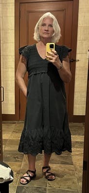Easy breezy everyday dress. Soft and comfortable. Love the pockets and eyelet detail at hem and sleeves. Perfect stretch up top and flattering. Loved it so much I bought it!