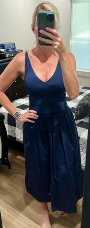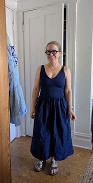 Perfect, classic, mixed media dress. I love navy and it suited so many needs/events. Travels well - quick steam of the cotton skirt and it was ready to go. The chest is a little low cut and I could pull off a bra if needed.