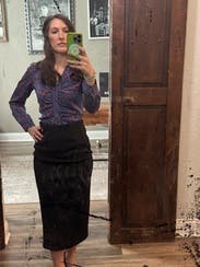 Rented to wear to work, buttons pull. Cute if I am standing but shows skin when I sit. Can’t wear in my work environment