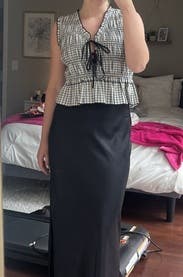 I sized upon this one because of reviews and was very happy with the look. It is a shorter top but works really well with high waisted pants. Kept a second month to wear multiple times!