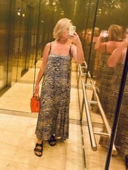 Brown animal print cotton (100% Rayon). Lining (100% Polyester). Maxi. Sleeveless. Square neck. Pull on. 43" from shoulder to hemline. Imported.