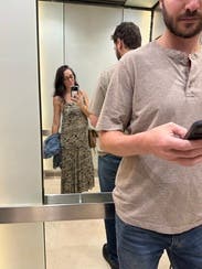 Such a comfy and cute dress to wear while 5 months pregnant. My prepregnancy Rails dress size is usually small, but I sized up to medium to accommodate bust. It fit just perfect!