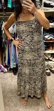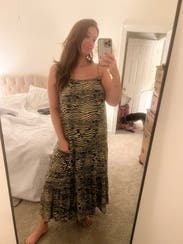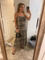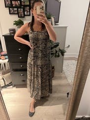 I love this slip on dress! I wore it twice for a lunch and a wedding rehearsal. I love that it’s free flowing and no restrictions. I think a large would have worked out as well.