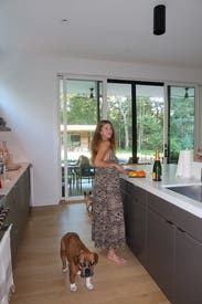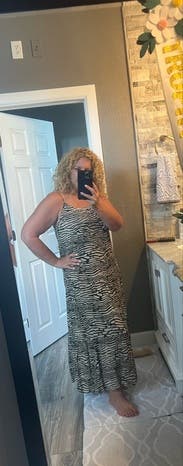 This is such a great dress! I sized up because of boobs, and I’m so glad I did! The top band is tighter than the rest of the dress, so definitely size up if you have a larger boobs. It has a nice flowing material and there is another layer underneath. Also comes with adjustable straps, which is great.