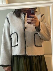 I loved this and had considered buying before it was on RTR but it's actually a little itchy so wore with a long sleeve underneath. Super cute and a great transition jacket