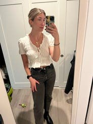 Despite the front tie element, I was able to wear with a regular bra. Loved the peplum fit and the sleeves were darling. This is a poplin material so it’s stiff, but I loved it. Great top for a date night. Easy to wear