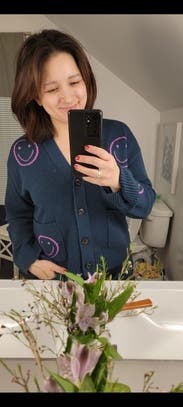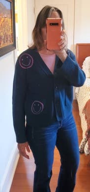 I love this sweater! Cute and comfortable. Wore it for WFH with leggings and paired with jeans for a few different social events. Super versatile and the smiley faces are joyful.