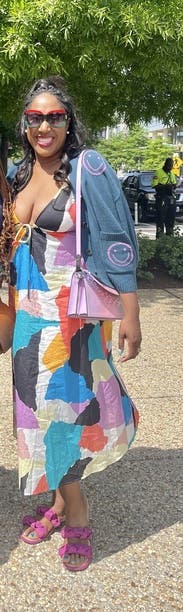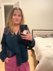 I liked this sweater a lot. The fit was just right and I felt like it was playful in a fun way. Loved the little purple pop of color in the smiley faces. I would rent again.
