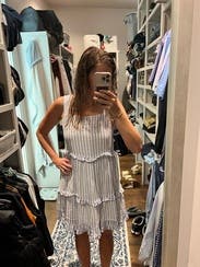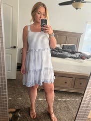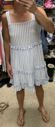 Love this dress, great summer throw on. Wore a large which was a bit big but needed for the length, as definitely a bit short (I'm 5'8 for reference). Good for post partum and nursing due to thicker straps that hide a nursing bra.