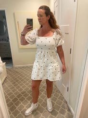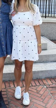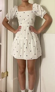 White polka dot cotton (100% Cotton). A-line. Square neck. Short sleeves. Tie closure. 33.5" from shoulder to hemline, Imported.