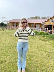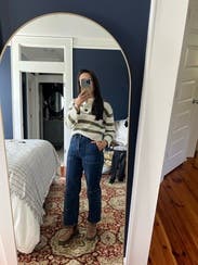 Really cute every day/casual sweater. Wore w high waisted jeans. Liked the contrast of the stripes and the buttons.