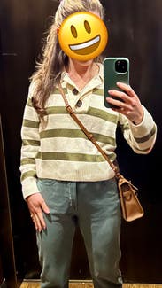 this is a super cute everyday sweater. fit well in all areas where i tend to struggle as a petite woman - not too long, arms were the right length, etc. would rent this again. good for mid-west transition to spring with fun green stripes but still heavier in weight.