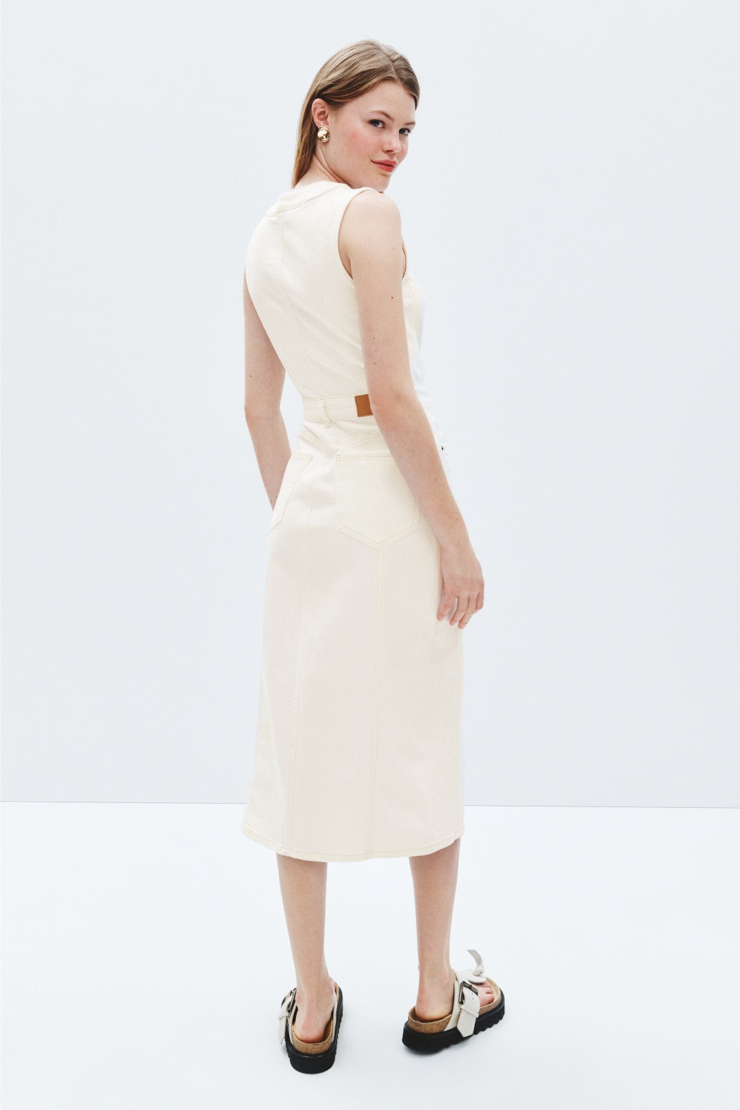 White (99% Cotton, 1% Elastane). Casual dresses. V-neck. Sleeveless. Front button closure. Shoulder to hemline length: 48.5". Slit length: 15.5". Imported.